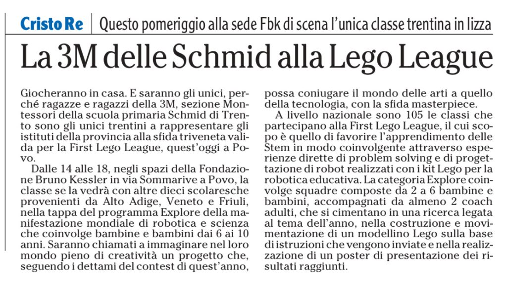 Il giorno 11 maggio noi della classe 3M abbiamo partecipato alla First Lego League 2024 a Povo con il nostro maestro di inglese, teacher Federico. First Lego League è una gara dove partecipano scuole da tutta Italia. Si partecipa con il kit Lego Spike, un particolare kit Lego con motori e sensori, e si creano costruzioni robotizzate di tutti i tipi.