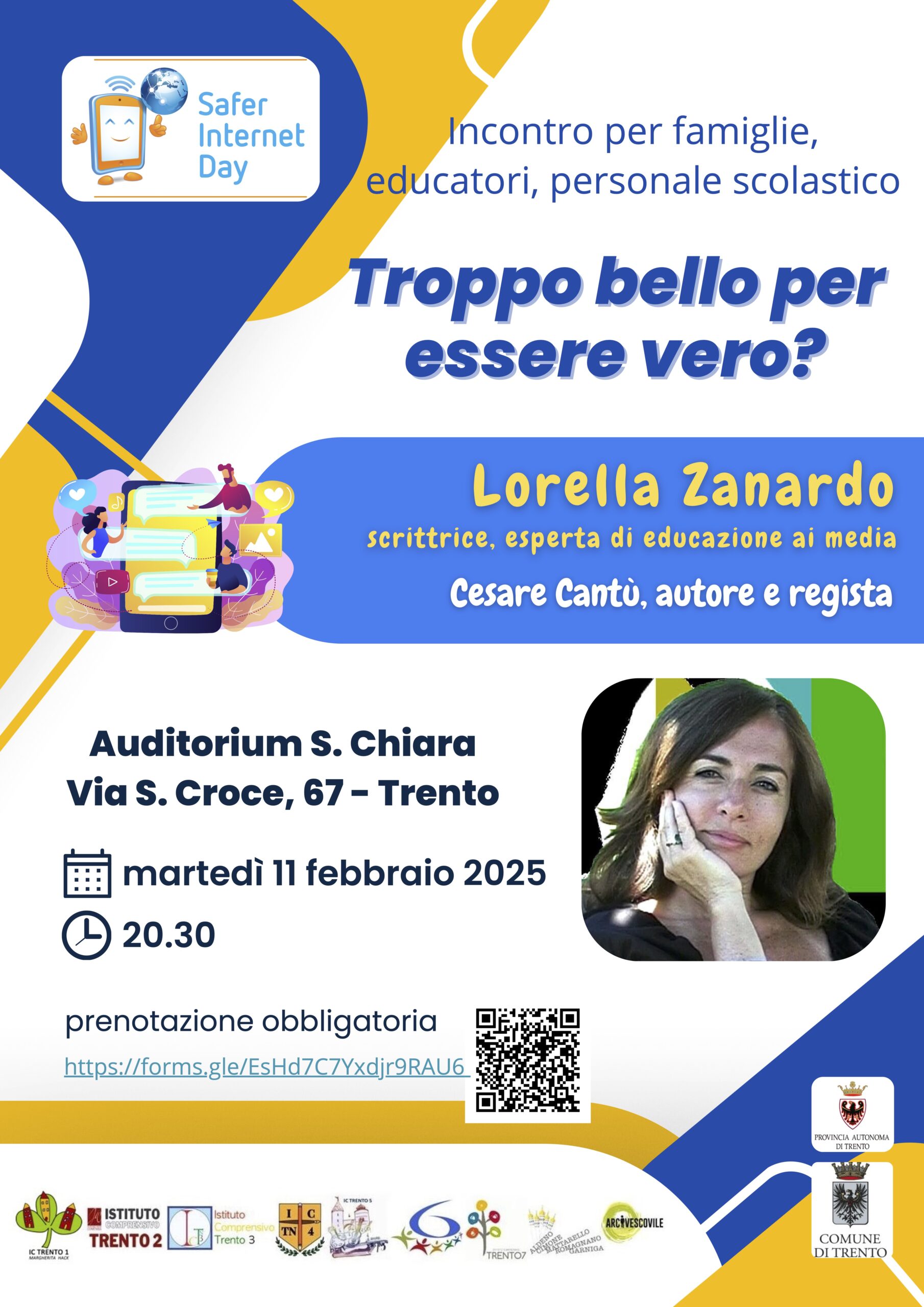 La sera, sarà riservata agli adulti: genitori e docenti potranno assistere ad una conferenza tenuta dalla dott.ssa Lorella Zanardo e dal regista Cesare Cantù, in una serata dal titolo “Troppo bello per essere vero”. Qui sotto la locandina della serata. Per prenotare un posto per la serata all’Auditorium S. Chiara, clicca qui: PRENOTA UN POSTO.