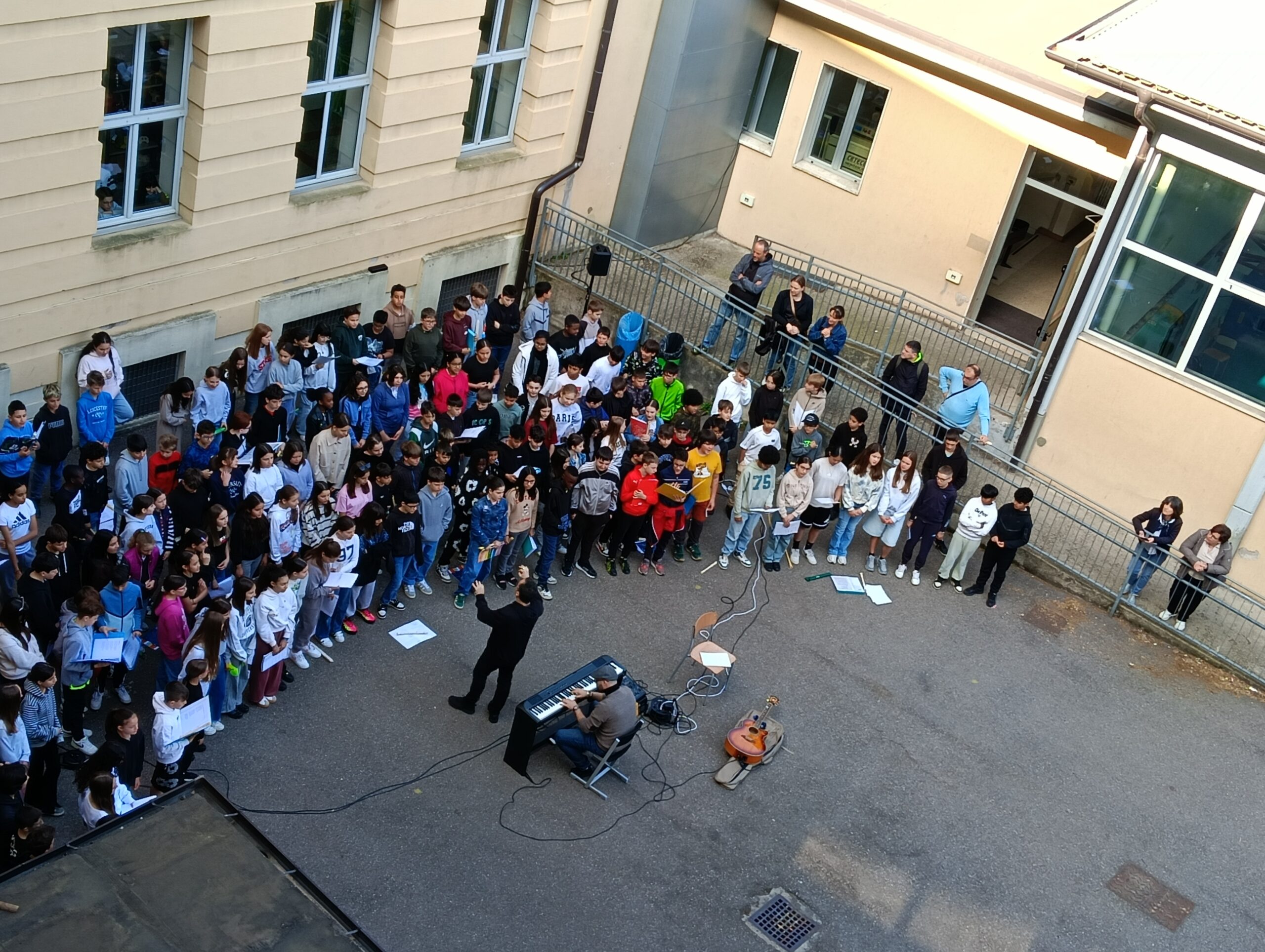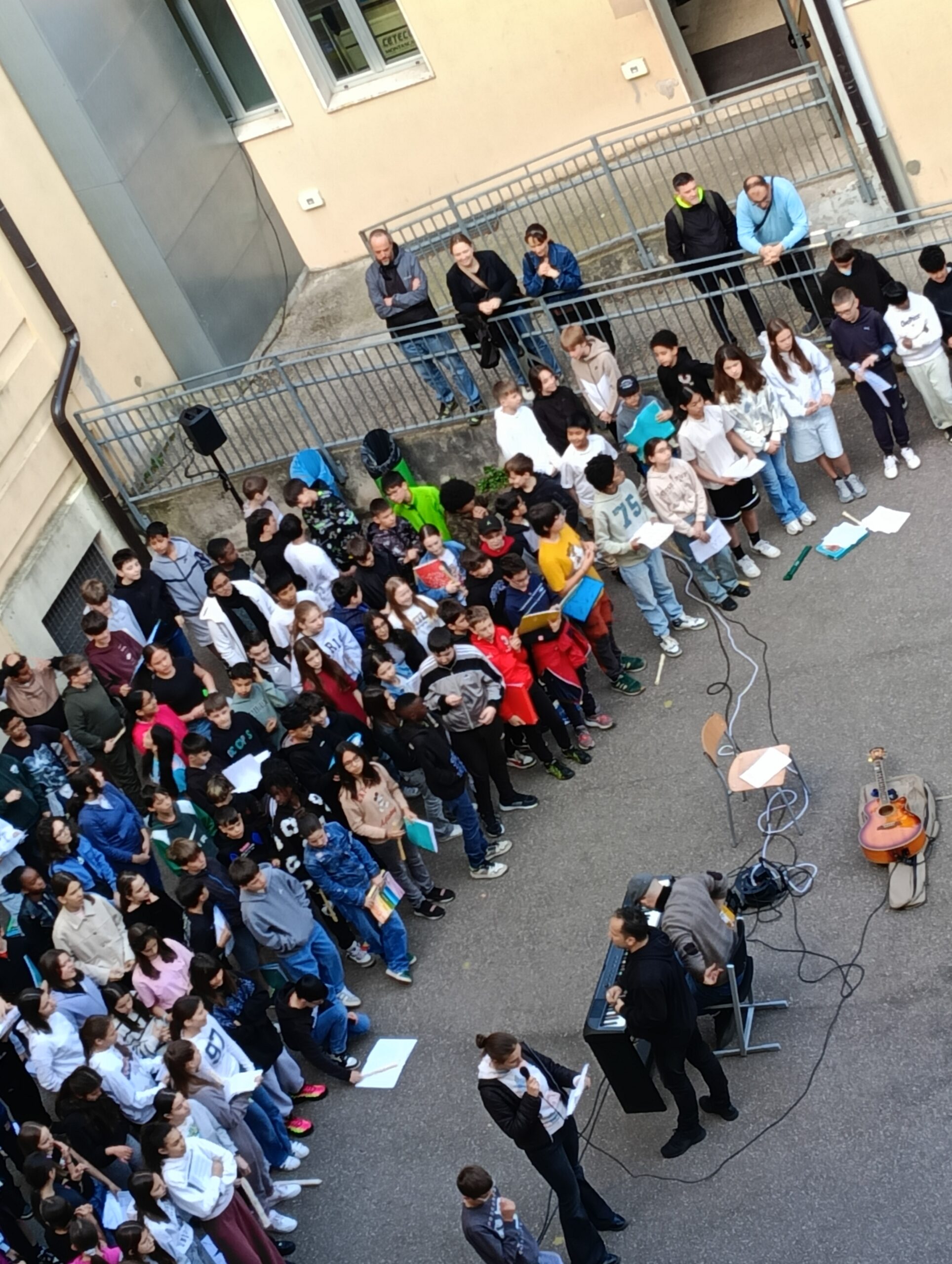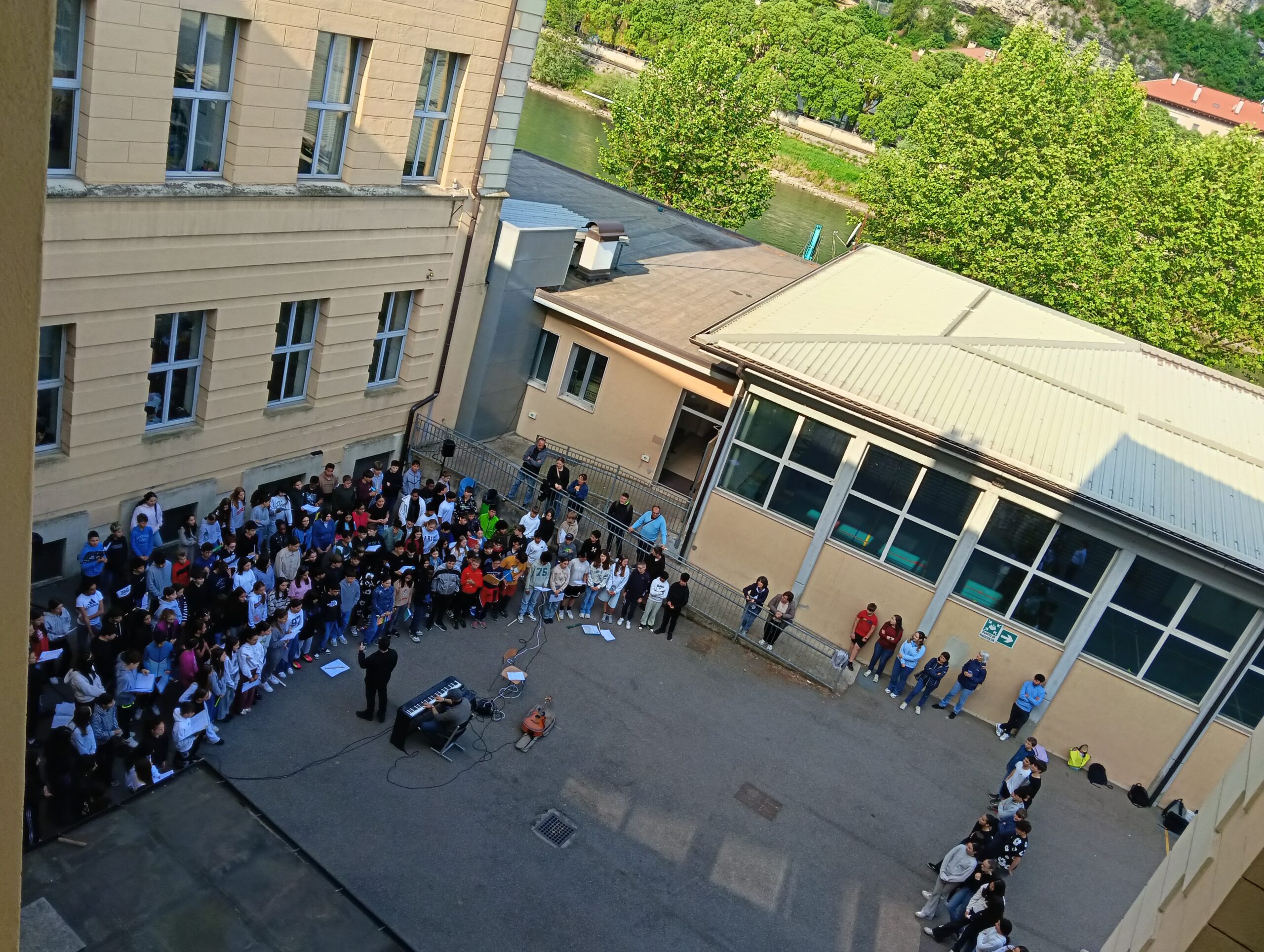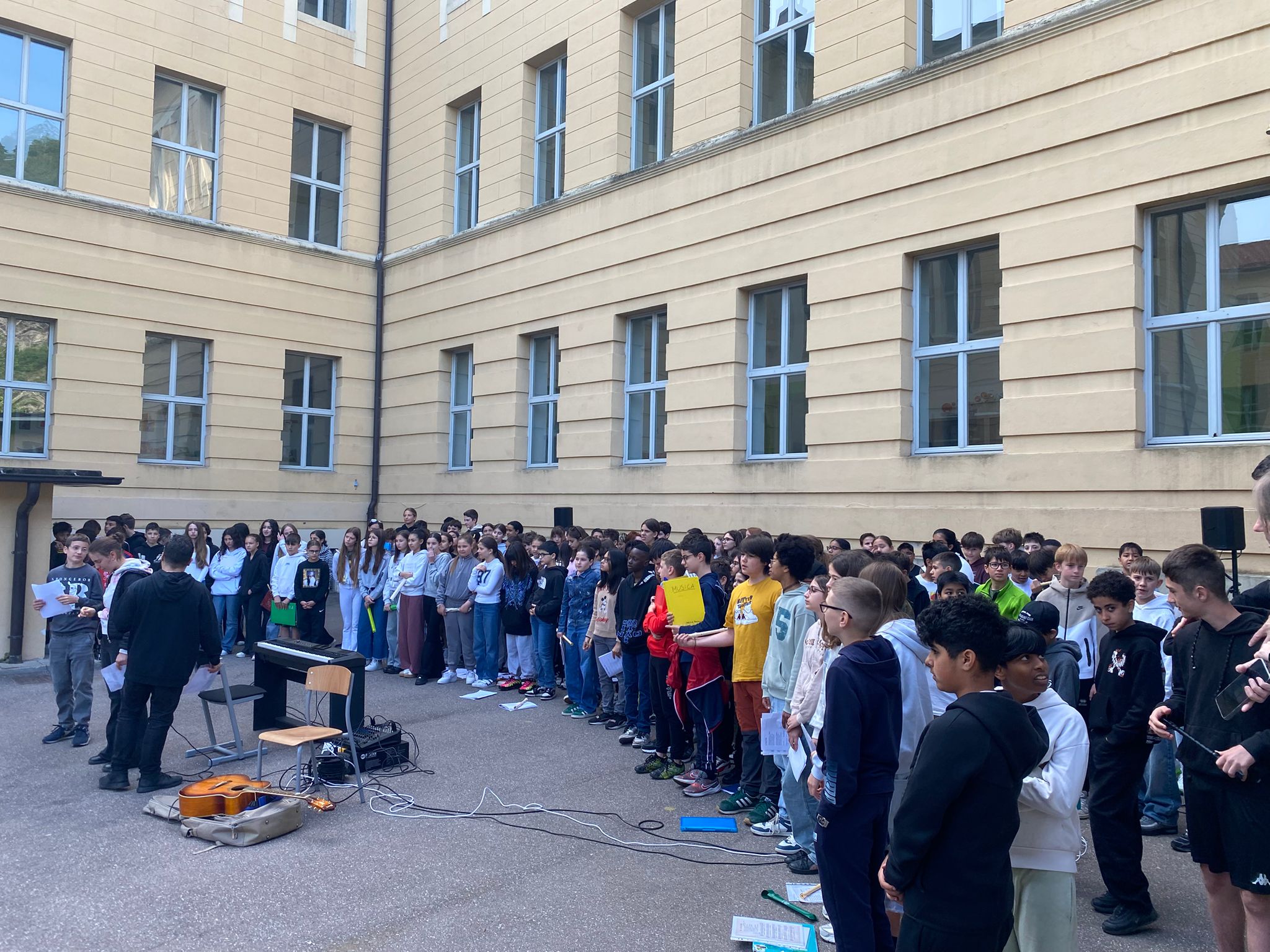 Un coro formato dalle voci di tutte le classi prime della SSPG “A. Manzoni”, insieme alle classi 2D e 2F, diretto e accompagnato dai Maestri Roberto Garniga e Marco Cataudella, ha accolto con diversi brani musicali le studentesse e gli studenti tedeschi arrivati a Trento per il gemellaggio “Creare legami”.